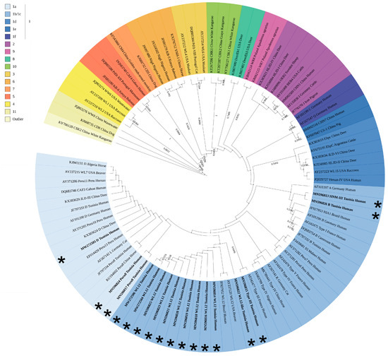 3.3. Phylogenetic Analyses Assign all E. bieneusi Strains to Zoonotic Group 1