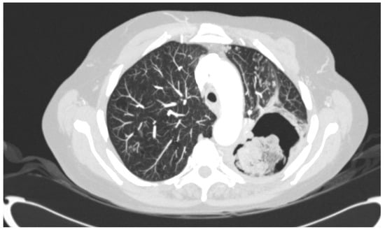 Chest computed tomography image showing a large pulmonary cavity in the left upper lobe with a mass lying in the cavity.
