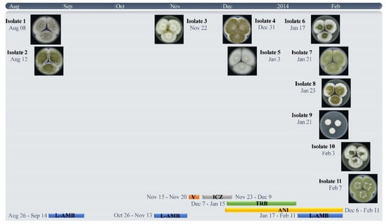 Timeline of the antifungal treatment and A. flavus culture morphology. VCZ, voriconazole; ICZ, itraconazole; L-AMB, liposomal amphotericin B; TRB, terbinafine; ANI, anidulafungin. The dates that clinical samples were obtained from the patient are indicated in the Figure, and the numbering of the isolates is based on the date the cultures became positive. Isolates 7 and 9 were cultured from the same clinical material but showed different morphologies. Isolate 8 was cultured from a clinical sample obtained 2 days after Isolates 7 and 9. This culture was earlier positive than the cultures of Isolate 9.2.2. Strains, phenotypic analysis, antifungal susceptibility and typing.