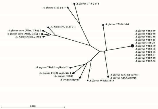 Maximum-likelihood phylogenetic tree of the 11 A. flavus isolates.