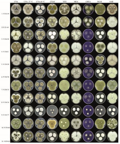 - Samson, R.A.; Visagie, C.M.; Houbraken, J.; Hong, S.B.; Hubka, V.; Klaassen, C.H.; Perrone, G.; Seifert, K.A.; Susca, A.; Tanney, J.B.; et al. Phylogeny, identification and nomenclature of the genus Aspergillus. Stud. Mycol. 2014, 78, 141–173. [Google Scholar] [CrossRef] [PubMed]