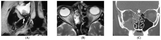 In immunocompromised patients, fungal sinus disease can present as nonspecific mucosal thickening or as a fulminant infection with vascular invasion [27], and acute invasive fungal rhino-sinusitis; which is the most urgent and severe form with a mortality of 50–80% [28]. The infection commonly begins as mucosal inflammation and rapidly spreads to the maxillary, ethmoid, or sphenoid sinus, usually affecting multiple, but unilateral sinuses (Figure 1A,B) [29]. The infection may spread to the adjacent soft tissue and orbits with subsequent destruction of the sinus walls and cribriform plate (Figure 1C) and extension to the orbits and/or anterior cranial fossa. The CNS may be affected through direct extension or, due to the angio-invasive nature of the fungus, through vascular invasion. It might be helpful to perform a CT scan to detect areas of destructed bones (Figure 1C), whereas MRI evaluates better fungal invasion of soft tissue beyond the sinuses to the cavernous sinus and the brain. Rarely, a fungal ball can be detected, which appears on T2-W hypointense (Figure 1A) due to the absence of water and with a hyperintense-inflamed mucosal lining.