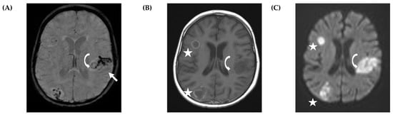 Vascular involvement in a 3-year-old girl with acute lymphoblastic leukemia (ALL) and proven central nervous system invasive mold infection (CNS IMD). The patient is alive but is a wheelchair user. Immunocompromised children have an impaired host immune system to fight against fungi (Figure 4A, curved arrow), which often results in an infiltration of the vascular structures (Figure 4A, straight arrow). Susceptibility-weighted image (SWI) (A) shows ring-like fungal infection on the left side (curved arrow) and thrombosis of the deep medullary veins (straight arrow), which are visualized as low signal intensity at SWI. Enhanced T1W (B) shows multiple ring-enhancing fungal abscesses on the right (star), but no enhancement on the left side. Diffusion-weighted image (DWI) (C) shows restricted diffusion within multiple ring-enhancing fungal abscesses on the right (star). The infarct with diffusion restriction (C) on the left involves the nonenhancing ring-like structure shown in the SWI (A, curved arrow).