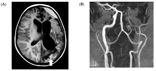 Vascular involvement in a 5-year-old boy with acute lymphoblastic leukemia (ALL) and probable central nervous system invasive mold infection. The patient is alive with residual right-sided hemiparesis. Magnetic resonance imaging (MRI) shows a large hemispheric infarction on the left side and cortical necrosis (arrow) on T1-W images without contrast (A). Time-of-flight magnetic resonance angiography (TOF-MRA) (B) shows only weak flow of the left internal cerebral artery.