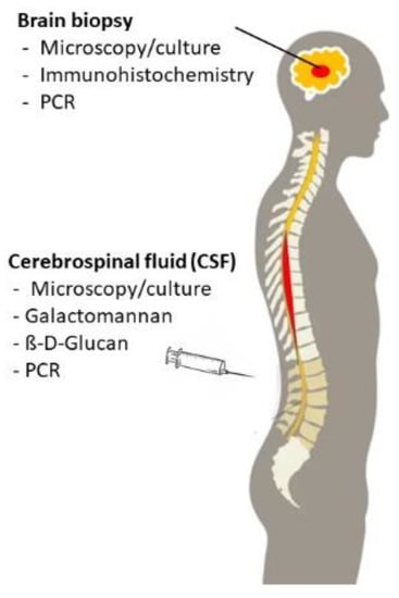 In addition to imaging studies, microscopy, culture as well as non-culture-based tests detecting fungal DNA or antigens are important diagnostic tools in immunocompromised patients with suspected CNS IMD. Diagnostic material includes the cerebrospinal fluid (CSF) which is usually easy to obtain. However, CSF remains nondiagnostic in patients with fungal brain abscess who mostly do not suffer from fungal meningitis. In these patients, a biopsy is required to establish the diagnosis of CNS IMD (Figure 6).