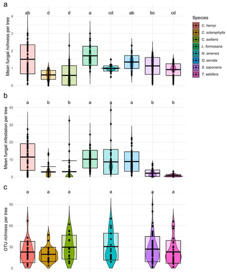 Difference between the eight studied tree species with respect to (a) mean fungal richness and (b) mean fungal infestation, both based on visual assessment, and (c) OTU richness. Letter combinations indicate significant differences between tree species according to a Tukey post-hoc test applied to the linear mixed effects model. (a) p < 2.2 × 10−16, (b) p < 2.22.2 × 10−16, (c) p = 0.1755.