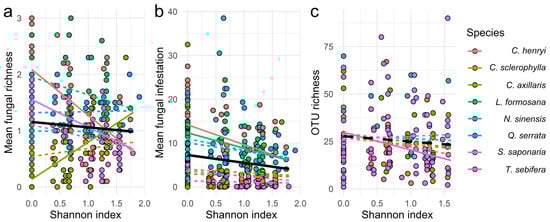 Effects of Shannon diversity in the local neighbourhood on (a) mean fungal richness and (b) mean fungal infestation, both based on visual assessment data and (c) on OTU richness. The overall regression line (in black) was obtained from a mixed model with Shannon diversity as the fixed factor and species identity and neighbourhood composition as random factors (a) p = 0.0330, (b) p = 0.0041, (c) p = 0.0645. The species-specific regression lines (in colour) were obtained from a mixed model with Shannon diversity and species identity as the fixed factors and neighbourhood composition as random factor. Regression solid and dashed lines represent significant (p < 0.05) and non-significant (p > 0.05) effects, respectively, according to a non-overlap of the confidence intervals of the unbiased predictors for the slopes with zero.
