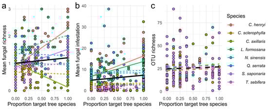 Effects of the host tree species proportion in the local neighbourhood on (a) mean fungal richness and (b) mean fungal infestation, both based on visual assessment, and (c) on OTU richness. The overall regression line (in black) was obtained from a mixed model with Shannon diversity as the fixed factor and species identity and neighbourhood composition as random factors (a) p = 0.0138, (b) p = 0.0154, (c) p = 0.2875. The species-specific regression lines (in colour) were obtained from a mixed model with Shannon diversity and species identity as the fixed factors and neighbourhood composition as random factor. Regression solid and dashed lines represent significant and non-significant effects respectively, according to a non-overlap of the confidence intervals of the unbiased predictors for the slopes with zero.