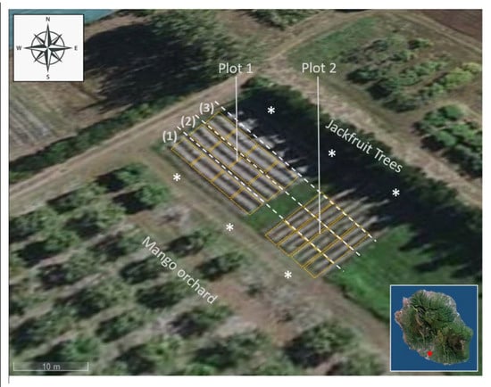 Environmental context of pineapple plots located in Reunion Island. Plot 1: North-West/South-East-directed rows; Plot 2: South-West/North-East-directed rows. (1) Plot sections proximal to the mango orchard, (2) central section of the plots, and (3) plot sections near the jackfruit trees. Quadrats are shown as yellow rectangles. White asterisks indicate coring points.