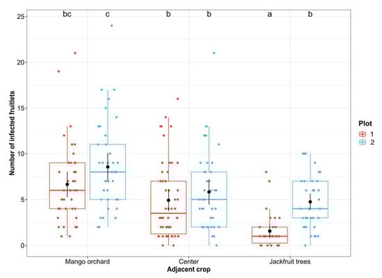 Scatter and box plots of numbers of FCR-infected fruitlets (IF) per pineapple fruit in the function of the adjacent crop according to plot orientation (Plot 1: Red, Plot 2: Blue). Black dots with bars show mean numbers of IF per pineapple with asymptotic confidence intervals at 95%. Letters indicate significant average differences between plot x sections (n = 40) according to Tukey’s multiple comparison test (p ≤ 0.013).