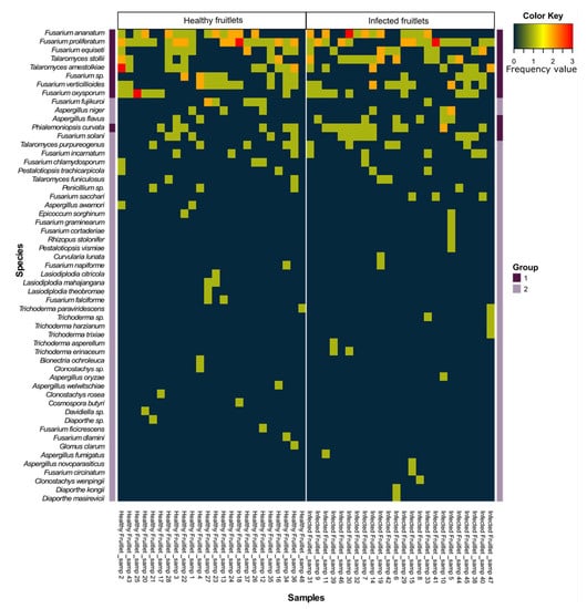 Heat map representation of fungal species frequencies in healthy and infected fruitlets of each quadrat. Group 1 corresponds to species identified in at least 25% of healthy and infected fruitlet sets, and Group 2 shows species identified in less than 25% of healthy and infected fruitlet sets.