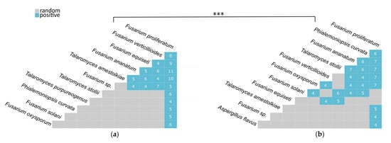 Matrixes of fungal species co-occurrences determined in healthy (a) and infected fruitlets (b) based on a pairwise approach. Significant positive associations are indicated in blue with the corresponding number of observations. Random associations are indicated in grey. The correlation between matrixes was assayed by the Mantel test (*** significance at p ≤ 0.001).