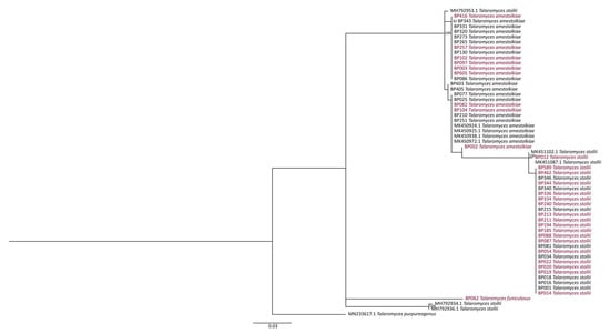 Phylogenetic tree of Talaromyces species computed by Maximum Likelihood (ML) analysis (TPM2+G as the best fit model) and based on a β–tubulin sequences dataset. Only ML bootstrap branches that support values greater than 70% are shown. Strains isolated from infected (IF) and healthy fruitlets (HF) are indicated in red and black, respectively. The tree is rooted with T. purpureogenus accession MN233617.1.