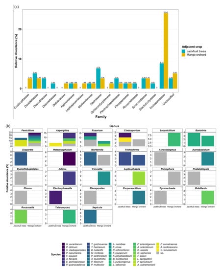 Relative abundances of fungal isolates identified from soil sampled on either side of the pineapple plots (jackfruit trees or mango orchard) at (a) family, (b) genus, and species taxonomic levels.