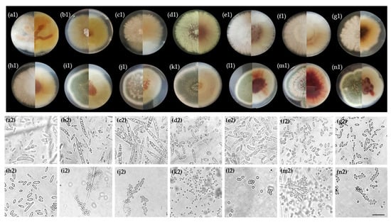 Talaromyces species showed circular to oval colonies with short and rough mycelium characterized by a green coloration in the oldest zone and with a white ring on the edges. The isolates identified as T. amestolkiae could be distinguished by a red pigmentation visible at the bottom of the Petri dishes. This was in addition to the secretion of a red exudate in the center of the colonies (Figure 10l1–n1). Microscopic observations of Fusarium species isolates showed straight (Figure 10a2–c2) and curved fusiform macroconidia (Figure 10d2,e2), while microconidia were ovoidal (Figure 10d2,e2) or ellipsoidal (Figure 10a2–c2,f2–h2). Talaromyces amestolkiae and Talaromyces stollii exhibited aggregated conidia with an ellipsoidal shape (Figure 10i2–n2).
