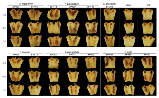 FCR symptoms observed 7 days post-inoculation (dpi) following controlled inoculations of five putative pathogenic fungal species in the blossom cup of fruitlets from the low (L), median (M), and upper (U) parts of ‘Queen Victoria’ pineapple fruit. F. ananatum strain BP383 was used as positive control; H2O: Sterile water-inoculated; mock: No inoculation.