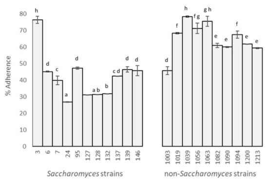 Percentages of adhesion (Figure 1) showed values of between 26.78% (S. boulardii) and 78.38% (L. thermotolerans). According to the Duncan test (α = 0.05, F = 116.39, p = 0.00), there were eight significantly different, sorted by decreasing percentage of adhesion. The highest results were for one Saccharomyces and two non-Saccharomyces strains (3, 1039, and 1063) with values of 76.37 ± 2.10%, 78.30 ± 0.49%, and 75.52 ± 2.96%, respectively. The next three higher groups include the rest of the non-Saccharomyces, except for strain 1003 (P. kudriavzevii).