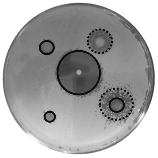 Inhibition halo of yeast growth in presence of antifungals assayed. Black line/circle represents total inhibition of the yeast growth, and dotted line/circle represents partial inhibition of the yeast growth.