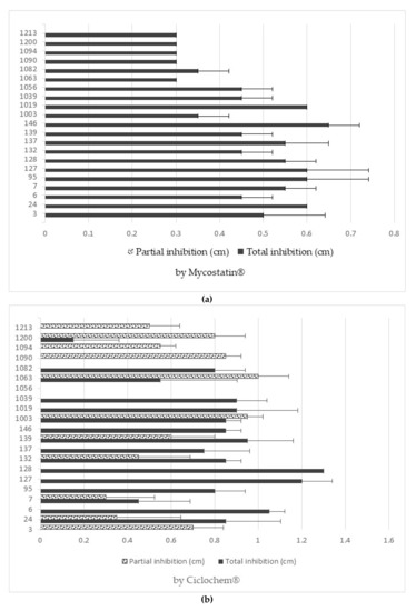 Figure 3 shows clear examples of total and partial inhibition. In the case of nystatin and ciclopirox olamine, the strains with the highest resistance (and therefore the smallest halo of inhibition) were non-Saccharomyces. On the other hand, with clotrimazole and fluconazole, Saccharomyces strains were the most resistant. All data are shown in Figure 4a,b.