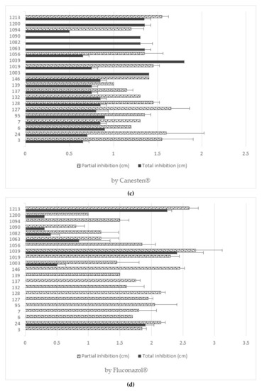 Partial and total inhibition of each yeast against Mycostatin® (a), Ciclochem® (b), Canesten® (c), and Fluconazol® (d).