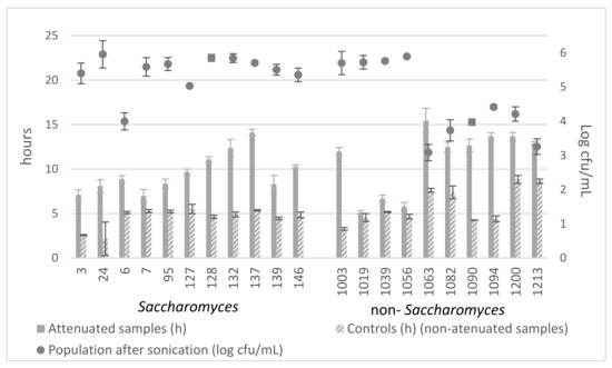Overall, without subjecting the strains to sonication, the strains of Saccharomyces had a similar vitality (they started growing between 2.17 h and 5.51 h), while for the non-Saccharomyces strains, there was more variation (between 3.27 h and 8.83 h).
