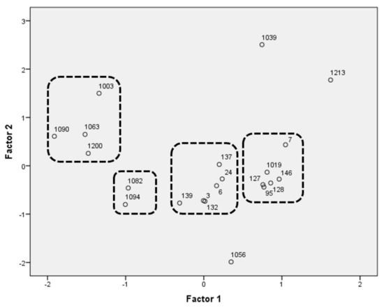 Table 5 shows the explained variance and the factor loadings, which describe the degree of correlation of the principal components with the functional traits examined. The analysis accounted for 77.61% of the total variability. The disposition of strains is represented in Figure 6, where there are four groups (two groups outline the behavior of the Saccharomyces, and the other two non-Saccharomyces) and three outliers. As a result of the PCA, five strains were selected as being representative of the whole population.
