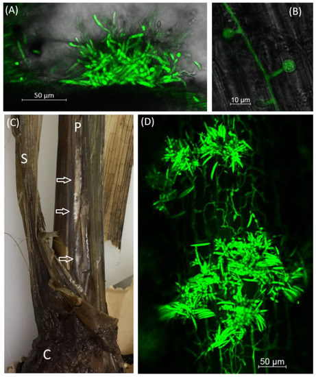 (A) Macroconidia arising from sporodochia on the mid-rib of the oldest erect leaf on a glyphosate injected ‘Williams’ plant 3.5 weeks after treatment with glyphosate, (B) Chlamydospores forming in the leaf mid-rib of an herbicide then fungicide sprayed plant (6 weeks after inoculation), (C) Signs of GFP Foc colonising the outer leaf sheath of a pseudostem of an herbicide sprayed, inoculated ‘Cavendish’ plant. White mycelia visible in the split pseudostem are highlighted with white arrows. C—corm, P—pseudostem, S—senescent leaf (16 weeks after inoculation) and (D) Sporodochia on the stem of a GFP Foc inoculated plant drenched with fungicide and then sprayed with herbicide (16 weeks after inoculation).
