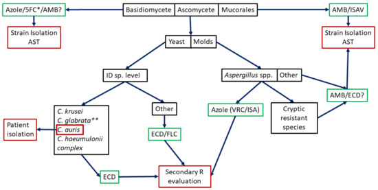 Potential algorithm for intrinsic resistance studies. Black boxes indicate where potential molecular methods would be used (most not designed yet). Green boxes indicate used empirical treatments. Red boxes indicate needed actions (patient isolation if C. auris is identified, the need of secondary resistance evaluation or the strain isolation and AST). 5FC: 5-fluorocytosine, AMB: amphotericin B, ISAV: isavuconazole, ID: Identification, ECD: echinocandins, FLC: fluconazole, VRC: voriconazole. * Combined with AMB for Cryptococcus spp. ** FLC Susceptible Dose-Dependent/Resistant.