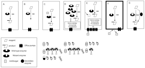 (A) Essential enzymatic reaction for a fungal cell. (B) Inhibition of the reaction by the antifungal drug. (C,D) Alterations of the interaction drug-enzyme. (C) Mutation on the drug target (less efficient or non-interaction). (D) Overexpression of the drug-target. In the box are the most commonly described mechanisms leading to overexpression. (E,F) Reduction of the cytoplasmic drug concentration. (E) Overexpression of efflux pumps (e.g., CDRs) by different underlying mechanisms (described in the box). (F) Impermeability. The drug is not trespassing the membrane (e.g., no transporter available as happens with 5-fluorocytosine and Histoplasma capsulatum. (G) Metabolic bypass. Grey and black and White pill symbols represent azole and echinocandin antifungals resistance mechanisms, respectively. Yeast and Aspergillus graphics under each of the mechanisms represent the description of each particular mechanism in Candida spp. and Aspergillus spp. respectively. The number of Yeasts and Aspergillus graphs show the relative prevalence of each of the mechanisms in Candida and Aspergillus spp. clinical strains, respectively. DNA graphs represent molecular tools’ availability to detect that particular mechanism in a drug/fungi combination.