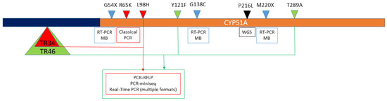 Mutations in A. fumigatus cyp51A (brown bar) and its promoter (5´UTR) region (dark blue bar) detected by the available molecular methods. Boxes indicate the molecular methods used to detect the mechanisms that are over them. Arrow heads represent the mutations linked with triazole resistance. Green and red arrow heads show the combined mechanisms that include CYP51A mutations together with promoter alterations described as tandem repetitions (TR). Light blue arrow and black heads represent single-nucleotide mutations detected by RT-PCR coupled with molecular beacons (RT-PCR MB) and whole-genome sequencing (WGS).