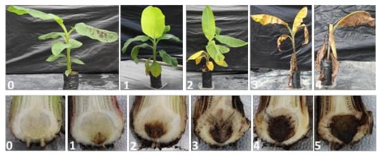 Figure 1. Rating scale for evaluation of external symptoms (upper panel) and internal rhizome discoloration (lower panel) caused by Fusarium Wilt to Cavendish banana in the greenhouse. Upper panel: 0—no yellowing; 1—initial yellowing mainly in lower leaves; 2—yellowing of all lower leaves with some discoloration of younger leaves; 3—all leaves with intense with intense yellowing; 4—plant dead. Lower panel: 0—corm completely clean; 1—isolated points of discoloration in vascular tissue; 2—discoloration up to 1/3 of the vascular tissue; 3—discoloration between 1/3 and 2/3 of the vascular tissue; 4—discoloration greater than 2/3 of the vascular tissue; 5—total discoloration of vascular tissue.