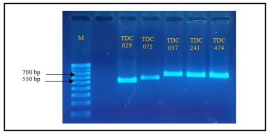 Five fungal endophytes which showed high inhibitory activity against Foc TR4 based on in vitro assay were identified through DNA sequencing (Table 4). All samples amplified the internal transcribed spacer region (ITS region) in the ribosomal DNA. ITS region is the official DNA barcode for fungi [21]. Amplification of the five fungal endophytes yielded a single 550–700 bp DNA fragment (Figure 5).