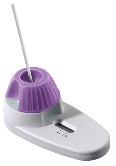 The SavvyCheck™ Vaginal Yeast Test (Savyon Diagnostics, Ashdod, Israel) was used as recommended by the manufacturer (Figure 1). This assay uses the concept of a lateral flow immunoassay system; the swab is therefore mixed with an extraction buffer liquid placed in a cap situated at the proximal end of the device for 20 s. To convey the liquid onto the test strip, the cap of the device is rotated 2 times. The probe then flows by capillary forces along the various strip components. The first immunologic interaction develops between the extracted yeast antigen and the anti-Candida polyclonal antibody conjugated to a colored bead, generating a colored antibody–antigen complex. The now newly assembled complex migrates to a second anti-Candida polyclonal antibody, which is adherent to the membrane at the test line. This second immunologic interaction generates a visual signal along the strip due to the formation of concentrated colored tags at this specific location. After 10 min, a blue line appears in the control region (C), confirming that the assay was performed correctly. At a minimal fungal load of 3 × 103, a blue line emerges in the test region (T), and the test can therefore be considered positive for VVC. In the absence of VVC, there is no line in the test region, and the test result is considered negative.