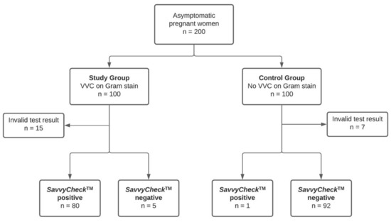 Women with microscopic evidence of VVC on Gram-stained smears (i.e., presence of hyphae) were assigned to the study group, whereas those without evidence of VVC (i.e., neither oidia nor hyphae) were assigned to the control group. Immediately after the Gram-staining procedure, the SavvyCheck™ Vaginal Yeast Test was performed by trained healthcare personnel as previously described. All demographic data were derived from obstetric databases and patient charts using the PIA Fetal Database, version 5.6.28.56 (General Electric Company, GE Viewpoint, Munich, Germany). The inclusion criteria for this study are shown in Figure 2.