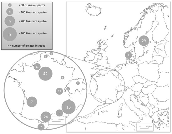 - Normand, A.-C.; Cassagne, C.; Ranque, S.; L’ollivier, C.; Fourquet, P.; Roesems, S.; Hendrickx, M.; Piarroux, R. Assessment of Various Parameters to Improve MALDI-TOF MS Reference Spectra Libraries Constructed for the Routine Identification of Filamentous Fungi. BMC Microbiol. 2013, 13, 76. [Google Scholar] [CrossRef] [PubMed]