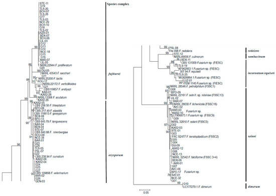 Finally, the eight isolates belonging to Fusarium dimerum-SC, Fusarium incarnatum-SC, Fusarium redolens-SC and Fusarium sambuccinum-SC were correctly identified at the species level.