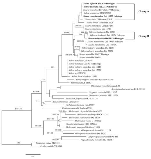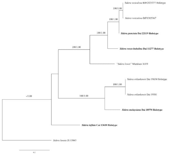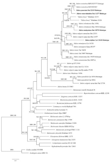 - Du, R.; Wang, L.; Zhou, M.; Chen, J.J. A new species of Sidera (Hymenochaetales, Basidiomycota) from tropical Asia. Phytotaxa. 2019, 387, 165–171. [Google Scholar] [CrossRef]