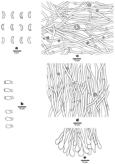Basidiospores—Lunate, hyaline, thin-walled, smooth, occasionally with one to four guttules, IKI–, CB–, (3.5–)3.9–4.5(–4.8) × (0.7–) 0.8–1 μm, L = 4.22 μm, W = 0.93 μm, Q = 4.53 (n = 60/1).