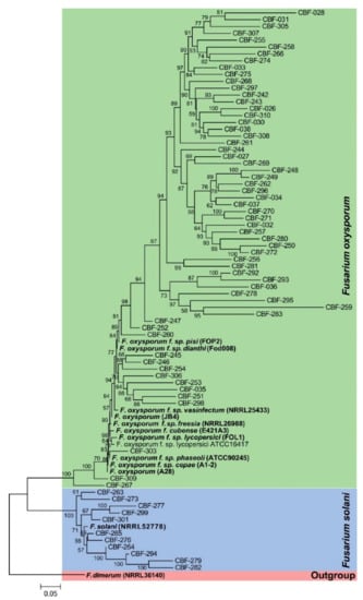 The translation elongation factor (EF-1α), RNA polymerase II second largest subunit (RPB2), and β-tubulin (TUB2) genes were selected to infer phylogenetic relationships between Fusarium isolates. Amplifications by PCR of the three housekeeping genes were conducted employing previously published primers [12,25,26]. Thermocycling conditions were as follows: one cycle of 3 min at 95 °C; 40 cycles of 1 min at 95 °C, 30 s for alignment (67, 59, and 61 °C for EF-1α, RPB2, and TUB2, respectively) and 1 min at 72 °C; finally, extension time of 10 min at 72 °C. PCR amplifications were performed in a Bio-Rad thermal cycler (T100TM) in 25 µL reactions containing 1 U of Taq DNA Pol (Qiagen), buffer 10× (MgCl2 15 mM), a final concentration of 0.5 µM of each primer, DNTPs mix (10 mM), 1 µL (~100 ng) of template DNA, and 19.3 µL of nuclease-free water. PCR products of 1269, 881, and 1500 bp were obtained for EF-1α, RPB2, and TUB2, respectively. The identification of the Fusarium isolates was performed in NCBI BLAST algorithm (https://blast.ncbi.nlm.nih.gov/Blast.cgi/ (accessed on 30 November 2020)) by comparison of EF-1α sequences against NCBI database. Amplicons were purified using the Wizard SV PCR and Gel Clean-Up kit (Promega) and sent for sequencing (Macrogen INC) using forward and reverse primers. The obtained sequences were edited, aligned by ClustalW, and concatenated using MEGA version 7.0.26 [27], the phylogenetic tree was generated through maximum likelihood method based on the best model Hasegawa–Kishino–Yano (HKY + G) using concatenated EF-1α, RPB2, and TUB2 data supported by 1000 bootstrap replicates. DNA Sequences of Fusarium genus deposited on Gene Bank were included as references. The tree was rooted through the outgroup Fusarium dimerum.