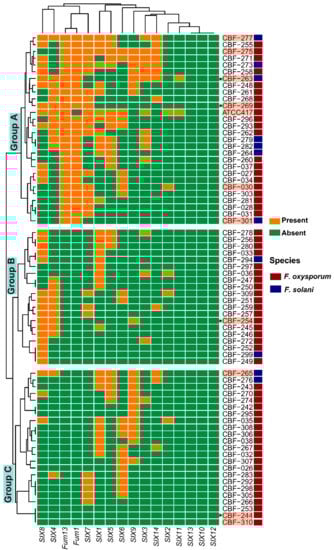 Clustering analysis of isolates based in SIX-Fum genes profiles (presence/absence) evidenced the formation of three big groups (Figure 2). All isolates belonging to group A, and only these ones, contained Fum1 and Fum13 genes. In group A, those isolates with the highest number of SIX genes were also found: CBF-263, CBF-271, CBF-273, CBF-275, and CBF-277 isolates. Additionally, seven of the eleven F. solani isolates (CBF-263, CBF-264, CBF- 273, CBF-277, CBF-279, and CBF-282) were clustered in group A. Group A included the ATCC417 strain. In addition to the absence of toxigenicity Fum genes, group B was defined by the absence of SIX11 gene and low frequencies of presence of SIX6, SIX7, SIX9, and SIX14 compared to isolates clustered in group A. The group C shared with the group B the absence of Fum and SIX11 genes, it was characterized by low frequencies of presence of SIX8 and SIX14. No correlation was found between the SIX genes repertoire and the relationships of the Fusarium isolates observed across the phylogenetic tree (Figure 1 and Figure 2).
