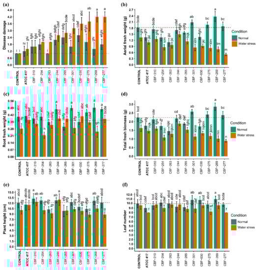 Effects of Fusarium isolates on disease damage and agronomical parameters of coffee seedlings. (a) Disease damage; (b) aerial fresh weight; (c) root fresh weight; (d) total fresh weight; (e) plant height; (f) leaf number. Data points represent mean ± SD (n = 5). Treatments sharing one or more letters are not significantly different (p < 0.05). Red dotted lines indicate control average.