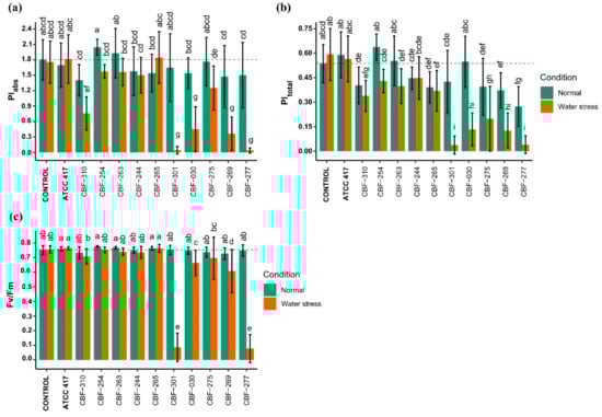 The ANOVA analysis with Tukey’s post hoc test demonstrated that the isolates CBF-254, CBF-263, and CBF-244 did not influence the variables PIabs, PItotal, and Fv/Fm either in no-water-stress or under stress conditions. Whereas on the contrary, a drastic decline (p < 0.01) of those three fluorescence parameters was caused by the isolates CBF-301, CBF-030, CBF-269, and CBF-277 under water stress conditions (Figure 4a–c).