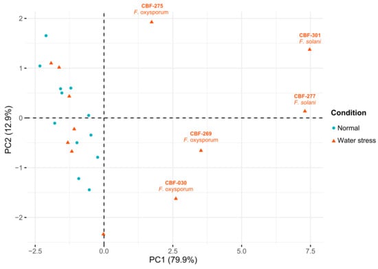 In accordance with the PIabs and PItotal results, the extreme decrease of Fv/Fm observed on coffee seedling inoculated with CBF-301 and CBF-277 and under water stress attest to irreversible physiological damage on these plants. A principal component analysis (PCA) was performed by employing the data of measurements of all photosynthetic variables. The first two principal components PC1 and PC2 explained 92.8% of the total variance (Table 2). The PC1 accounted for 80% of the variation and was correlated (r > 0.9) with most of the photosynthetic parameters except for Tr0/RC (r = −0.31). The clustering of Fusarium isolates was dependent of the photosynthetic status, which showed a clear discrimination of the five most pathogenic isolates: CBF-030, CBF-275, CBF-269, CBF-277, and CBF-301 (Figure 5).