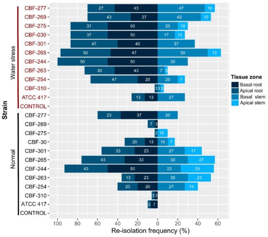 Interestingly, the isolates CBF-265 and CBF-244, which induced symptoms of disease in coffee seedlings without water stress, colonized in higher percentages (76 and 93%, respectively) the root tissue in absence of water stress. The CBF-030 isolate, which also caused disease symptoms under absence of water stress, colonized the root tissue in 33% but the percentages increased up to 87% under water stress condition.