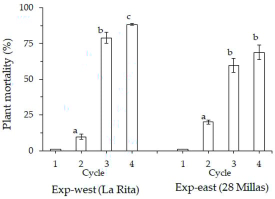 Aggregated plant mortality over all treatments by Fusarium wilt (Foc race 1) of Gros Michel banana during four crop cycles in two experiments (Exp-west in La Rita and Exp-east in 28 Millas) in the Costa Rican banana region. Bars with different letter in cycles are significantly different. N = 486 in Exp-west and 1646 in Exp-east. (Ierror bars represent the standard error).