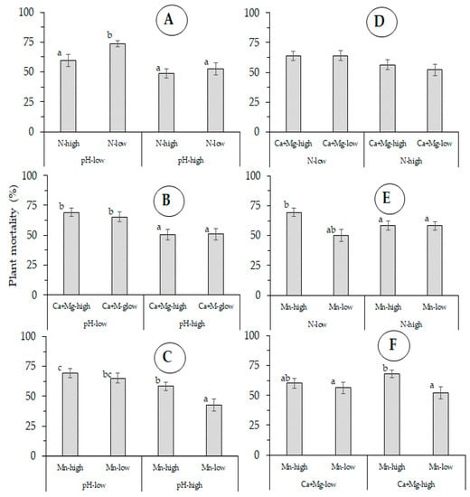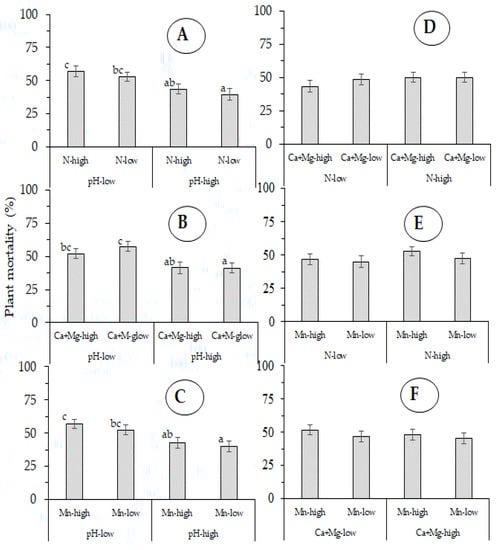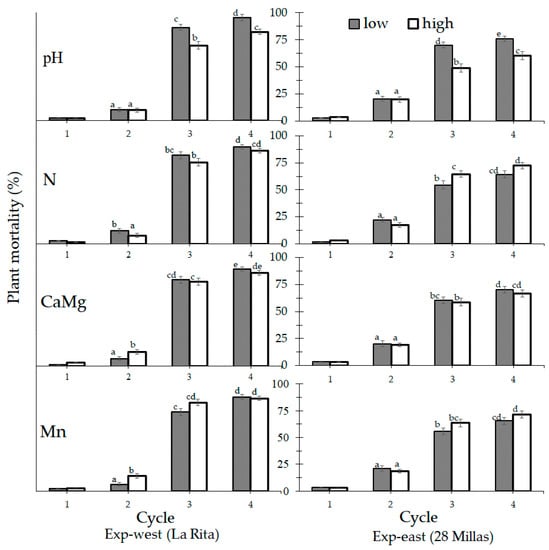 In Exp-west, plant mortality was also influenced by the interaction of pH-low and N-high (p ≤ 0.010), pH-high and Mn-high (p ≤ 0.016), and CaMg-low and Mn-high (p ≤ 0.007) (Figure 6). There were no differences in plant mortality in relation of the interaction of the tested soil chemical properties in Exp-east (Figure 7).