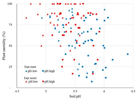 A higher soil pH (near and up to 6.0) can be linked with improved plant development but also to the lower plant mortality caused by FW. Both direct and indirect effects of soil pH can be playing a role in the findings. As a main soil property, pH affects other biotic and abiotic soil properties [31,55,56,57]. The exact causal-effect of the suppressive effect of a higher soil pH values cannot be determined based on the current study. The variation in the effect could be caused by interactions with the other soil properties that were evaluated (N, CaMg, and Mn).