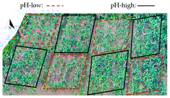 The relation between plant mortality and soil pH for each individual plot in the 3rd crop cycle for both experiments is presented in Figure 4. The inconsistent results in the literature are not surprising, if we see the scatter in the relation between pH and mortality in the figure. However, the figure clearly shows that a low soil pH always corresponds to a high plant mortality irrespective of the other conditions. The clear role of soil pH is visually confirmed on an aerial photo of the plantation between the 2nd and the 3rd crop cycle in Exp-east (Figure 5). The aerial perspective shows a clear reduction in soil cover in the pH-low plots as it was observed in both experiments.