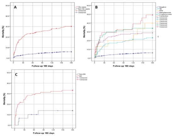 Kaplan–Meier survival curves. (A) Patients with and without opportunistic infections. (B) Patients without opportunistic infections, with tuberculosis, nontuberculous mycobacteria, cryptococcal disease, histoplasmosis, and with multiple opportunistic infections. (C) Patients with disseminated histoplasmosis and non-disseminated histoplasmosis.