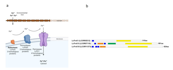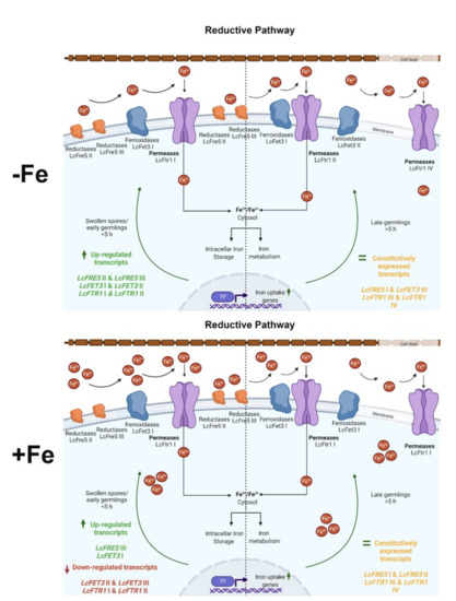 Schematic representation of L. corymbifera reductive iron assimilation (RIA): involving the ferric reductases, the multicopper oxidases and the ferric iron permeases. Differentially expressed genes belonging to the RIA during iron depletion (upper panel) and high iron (lower panel). Upregulated transcripts are indicated in bold colors; green represents upregulations, i.e., high expression of LcFTR1/LcFET3 transcripts that encode for the coupled LcFtr1/LcFet3 proteins; orange represent constitutively expressed genes, i.e., LcFTR1 III and LcFRE5 I. red represents downregulated transcripts. Under iron depleted conditions, two copies of the permease (LcFTR1 I-II) are developmentally regulated. LcFtr1 I is highly upregulated during early germination while LcFtr1 II is expressed in the germling stage. Illustrations created in Biorender (accessed on 30 December 2020).